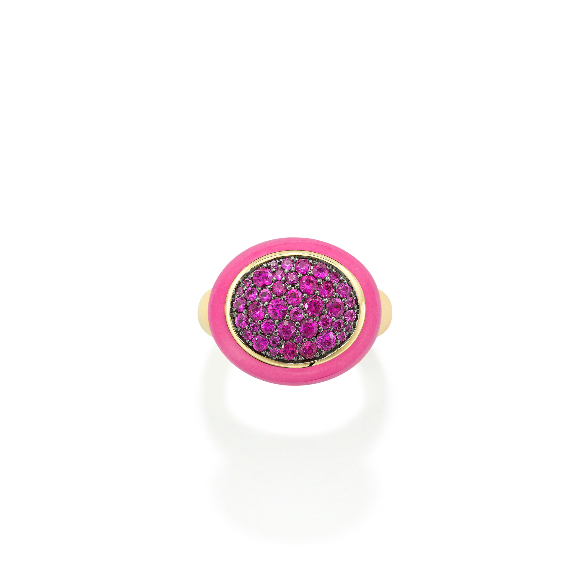A bold classic, reimagined. The Arena Ring in 14ct yellow gold is fully set with 1.25ct of pavé pink sapphires - designed to catch the light (and attention) from every angle. A modern icon, made to shine.