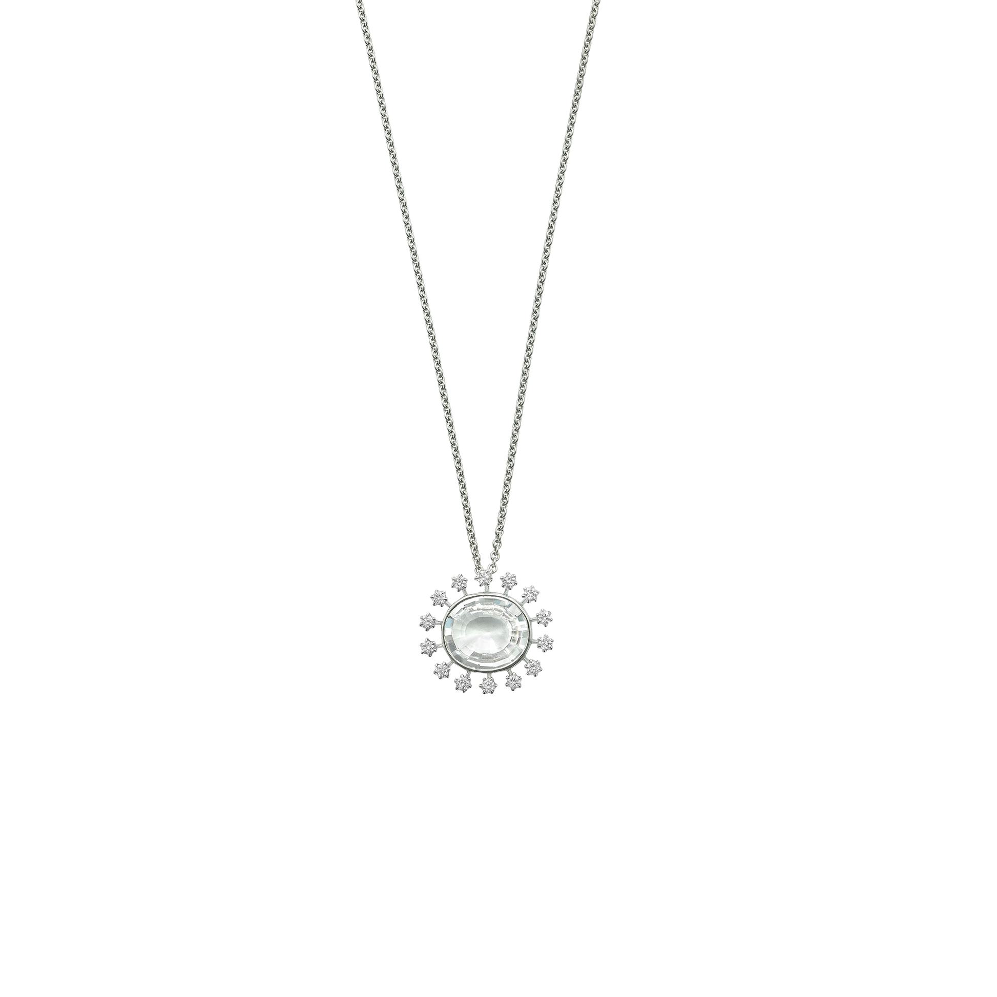 Crafted in 14ct white gold, it showcases a bold 2.91ct rock crystal and 0.30ct of diamonds set in a sculptural sunburst design. Contemporary, radiant and irresistibly eye-catching.