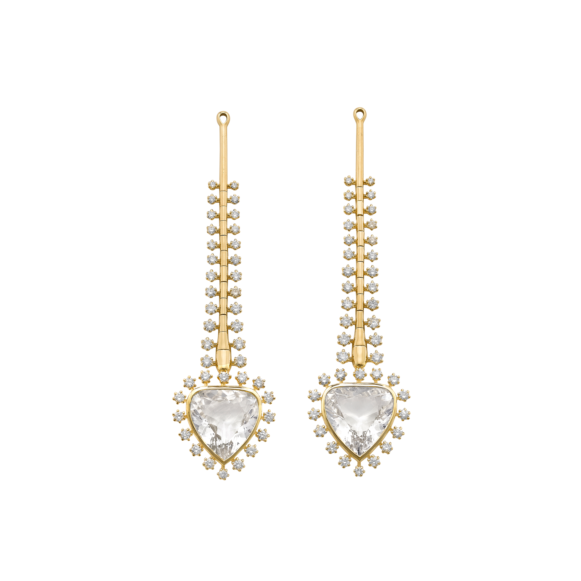 Bringing a statement to the Daystar collection, the latest diamond and rock crystal drop earrings deliver instant impact. These statement earrings are a nod to our hugely popular Tsar Star earrings. The drops feature a fully articulated long spine of double diamonds culminating in a shield-shape rock crystal surrounded by diamonds to mirror the tops. Perfect to wear in the evenings, they can also be worn by day, creating a spectacular sparkle with every movement.