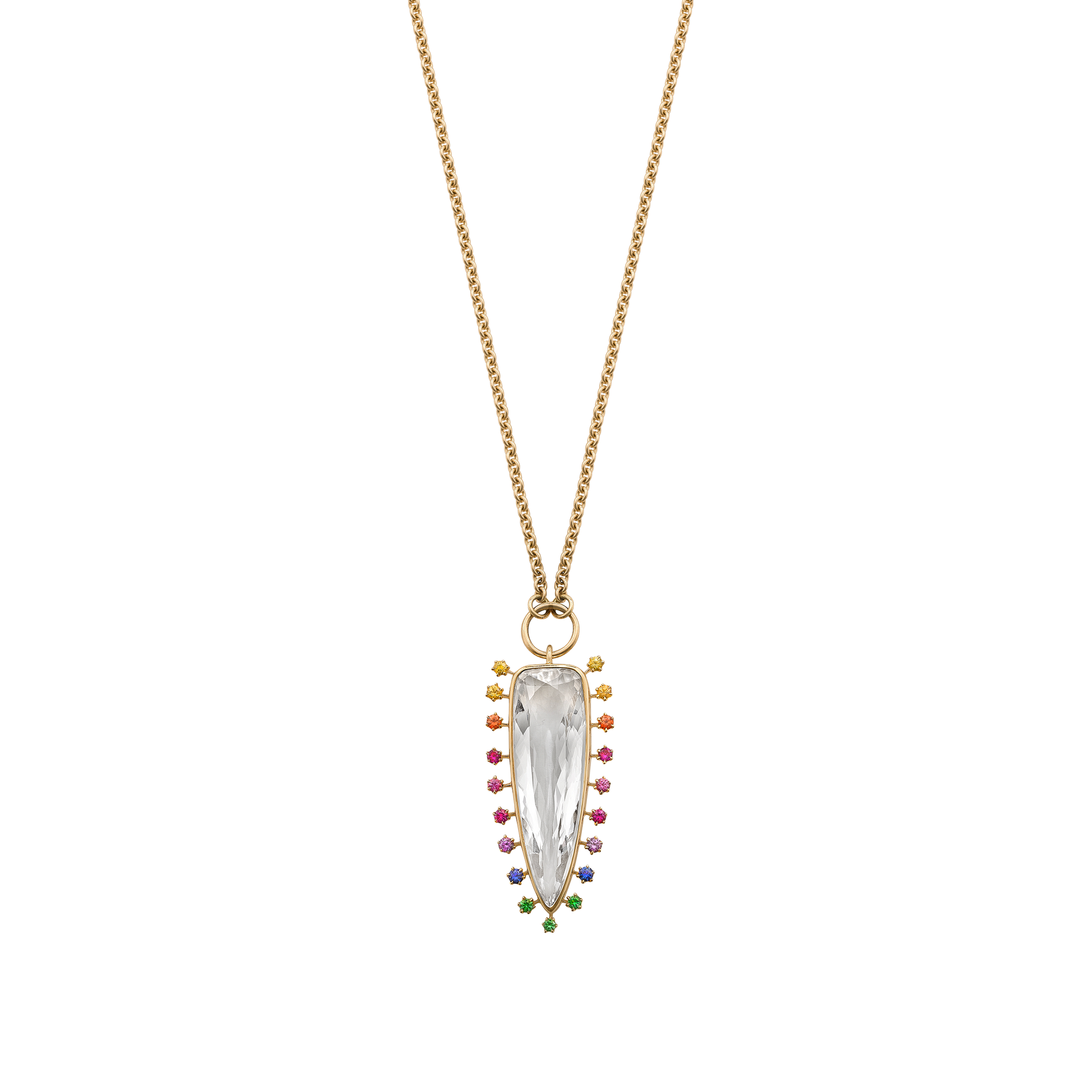 New to the Daystar collection, this beautiful dagger-shaped pendant in 14ct yellow gold features a rock crystal gemstone accented by rainbow sapphires, radiating out from the central stone with a sunbeam-like effect. Effortlessly evoking a summertime mood, they can be worn on their own or layered for an added impact.