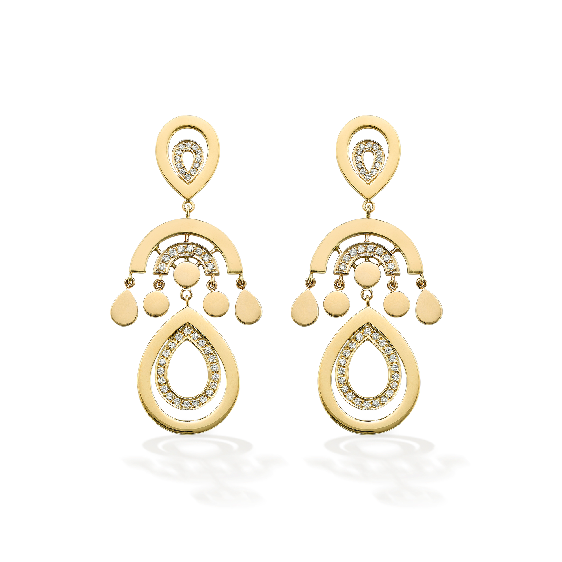 These diamond Siren Earrings, crafted in 9ct yellow gold, showcase elegant arches silhouette and a polished teardrops with sparkling diamond accents. Designed to catch the light from every angle, they bring refined drama to both everyday dressing and evening moments.