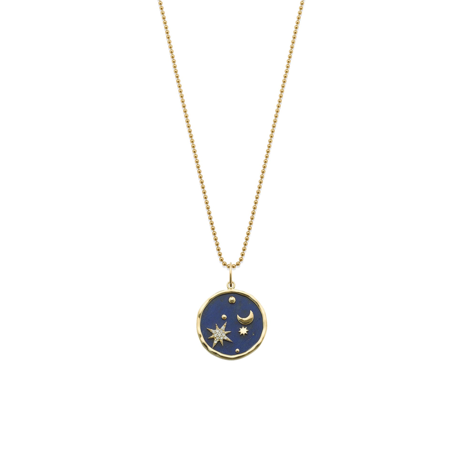 Rich lapis meets brilliant diamonds in this celestial star and moon pendant, intricately crafted in 14ct yellow gold. A striking, symbolic addition to any jewellery collection - perfect for layering, gifting, and wearing from day to night.